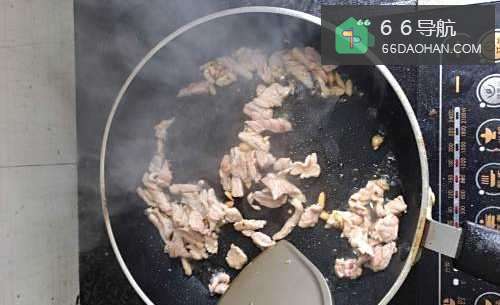3等到炒出蒜香后,将切好的猪肉倒进去一起翻炒。