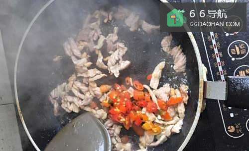 4猪肉炒一分钟左右后再将酸辣椒倒进去翻炒。