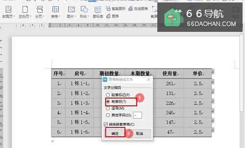 4在“表格转换成文本”对话框中,选择文字分隔符为【制表符】,然后点击【确定】;