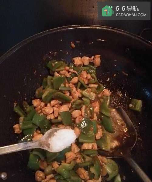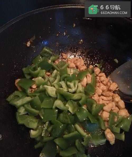 6鸡肉炒至八成熟后,将辣子丁倒入锅中,和鸡肉一起炒。