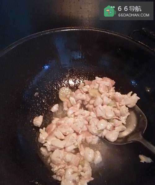 3将鸡丁放入锅中,用铲子快速翻炒,炒至鸡肉成白色。