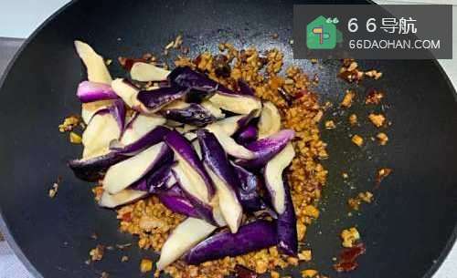 4放入茄子炒匀,加些热水翻炒至茄子熟