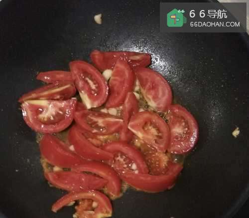 3继续放少许油,放切好的蒜炝锅后,放西红柿翻炒。