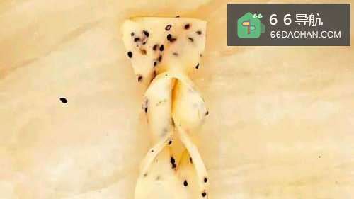5接着将一边的面皮从中间小口处翻出来,麻叶的形状既做好了。