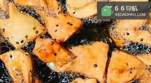 6锅中放入适量油,油温5成热时,将麻叶放入到锅中,小火炸3分钟后将麻叶捞出来,接着将油烧到8成热,再将麻叶放入到锅中,继续将麻叶炸成金黄色即可起锅食用。