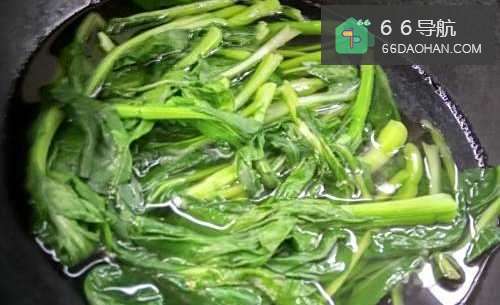 3在锅中添水(小半锅)攀特,开火,待水煮开后,将洗好的菜心放在锅中,焯煮2分钟,翻均匀。