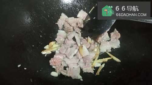 3五花肉过水清洗干净,切成肉片,重新起锅烧油,油热倒入切好五花肉片爆炒出油分,炒至五花肉片两面金黄,放入蒜米生姜片翻炒均匀即可。