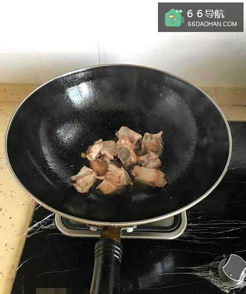4在锅子里依次加入食盐、排骨、姜片,并且在锅子里翻炒两分钟左右,直到排骨表面出黄色即可。