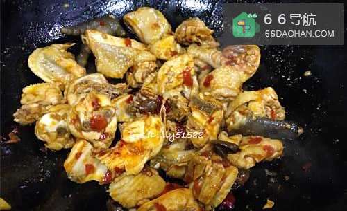 9鸡肉的水份炒干后,加入1汤匙的料酒和2汤匙豆瓣酱一起炒,料酒可以去腥。