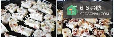 69、萝卜糕冷却切小块,放入锅中煎至两面金黄即可。