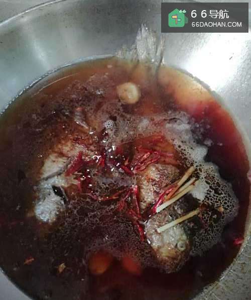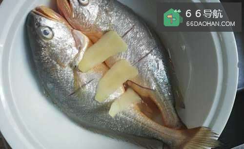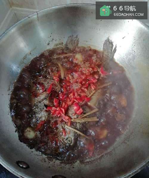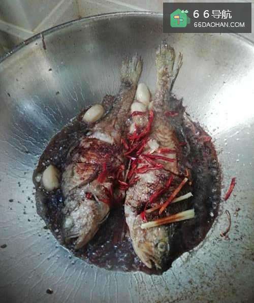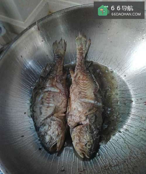 两面都煎黄后,放入生姜、蒜瓣在油中煎2分钟,加入黄酒、醋、糖、盐、酱油等佐料,端锅晃动均匀。