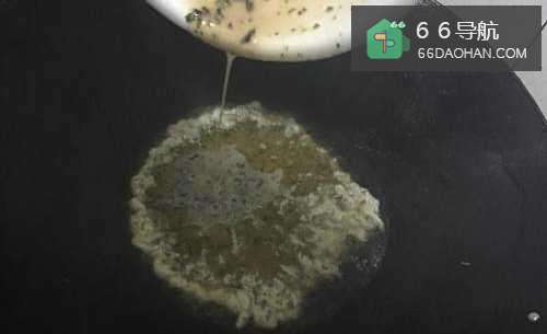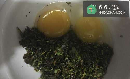 先把椿芽洗干净彻细,再打两个鹅蛋,如图。