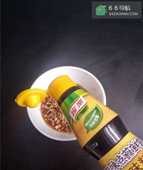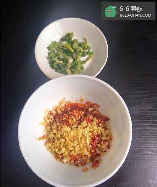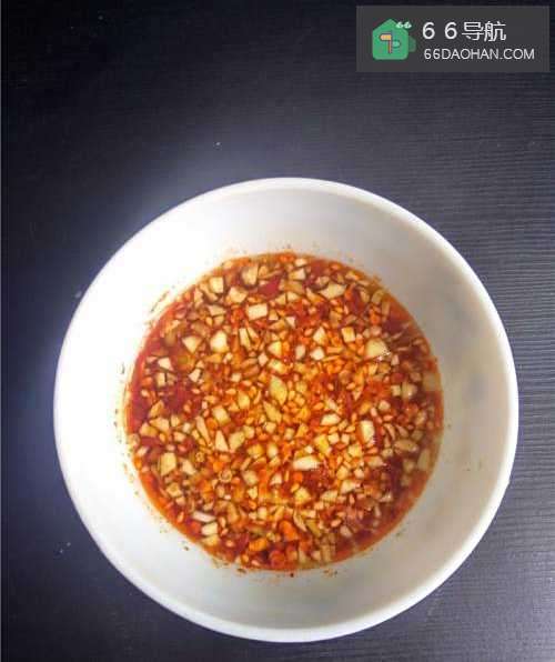6姜末,蒜末,小米辣末碗里,倒入鲜开水浸泡几分钟后,再调入海味点蘸鲜露。