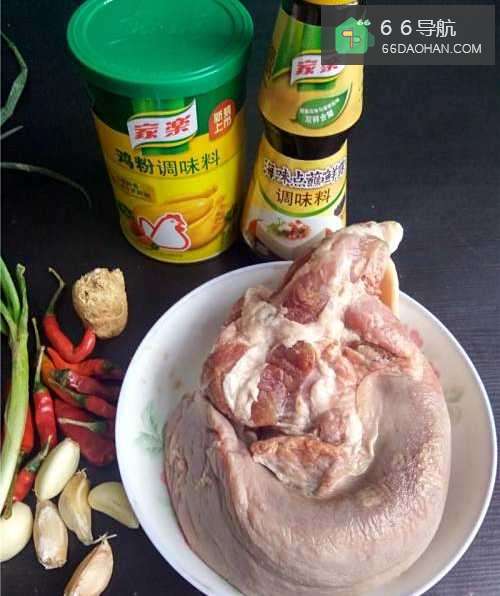 备好食材猪舌,老姜,大蒜,小米辣,小葱,鸡粉,海味点蘸鲜露。