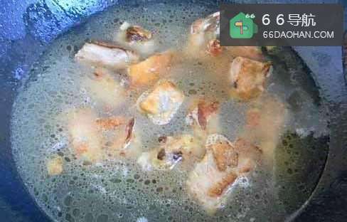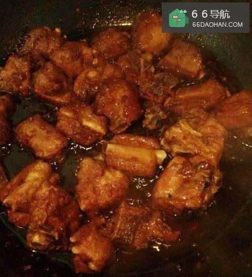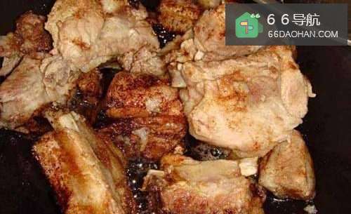 55、放入排骨炒,一直煸炒到排骨表面无水、变色后,金黄微焦的样子;