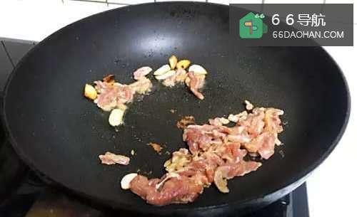 3中大火爆香蒜头,倒入肉丝,炒至8成熟时捞起备用