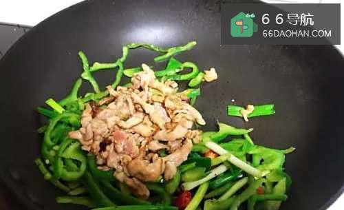 5炒至青椒软化后,倒入肉丝,加入酱油、糖、辣酱、生粉水调味