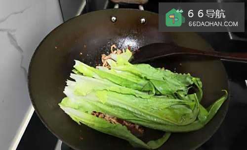7加入莴笋叶,可以进行切割也可以整块炒。