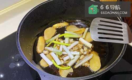 2小火爆香黑麻油与姜片后,下辣椒、蒜末、葱段一起炒香