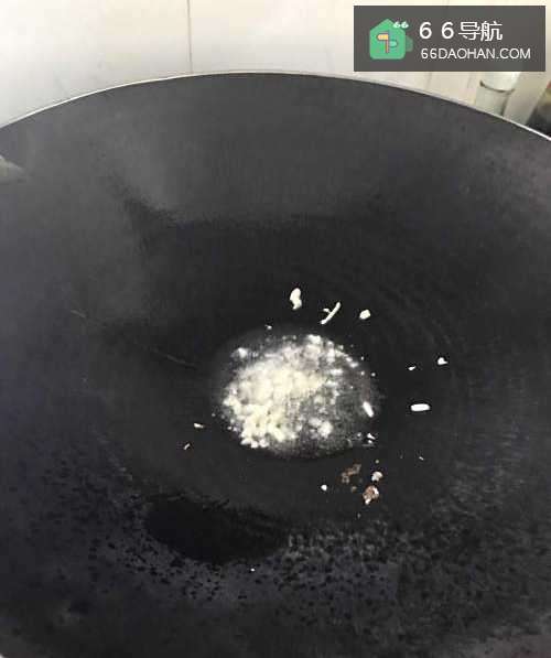 3炒锅烧热,放入花生油,加入蒜米爆香,然后把空心菜梗倒入,翻炒。