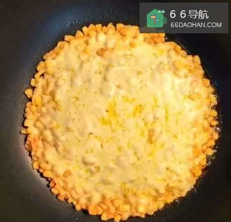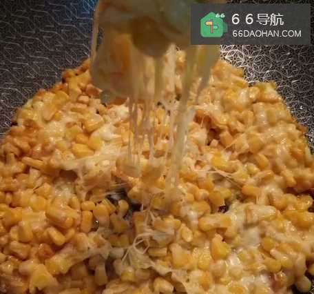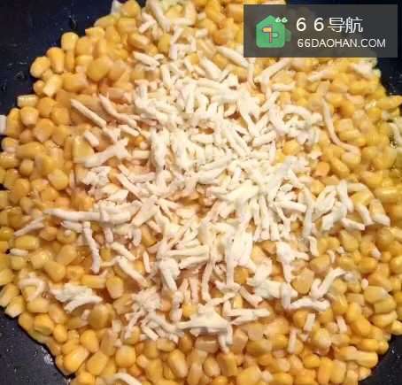 5倒入搅拌好的玉米粒,摊成饼状,撒上芝士碎,等芝士完全融化即可。