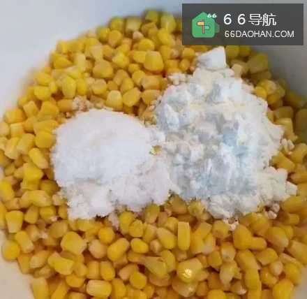 32勺玉米淀粉倒入玉米粒中,加入少量白糖,1个鸡蛋;
