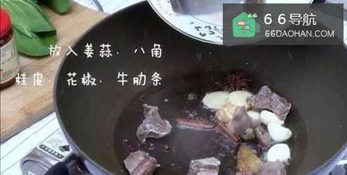 5冷油放入姜蒜,八角,桂皮,花椒,煸炒出香味,放入焯水过的牛肋条一起煸炒