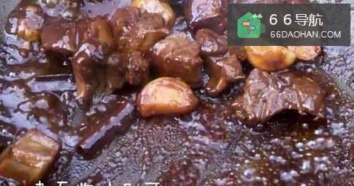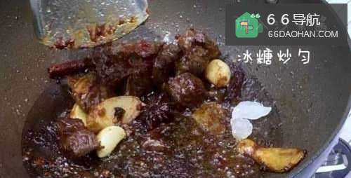 6煸炒至牛肋条微焦黄色时,放入沙茶酱,辣椒酱,冰糖一起炒匀