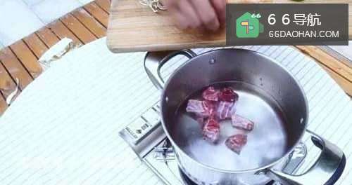 2牛肋条切块冷水入锅焯水(撇去浮沫)