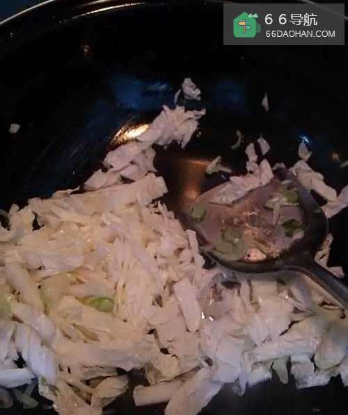 4葱香味出来后,先将白菜丝倒入锅中,用铲子翻炒均匀。