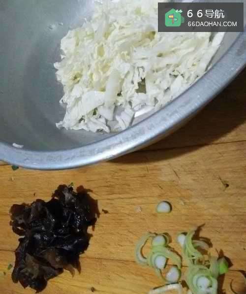 2将白菜洗净后,用刀切成丝,将木耳泡开后用水煮熟,再切成丝,葱也切成丝。