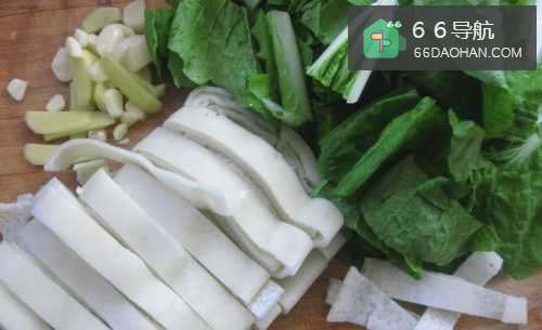 3白菜洗净切断,豆丝切成1厘米左右的条状,生姜大蒜切碎