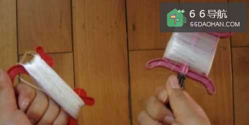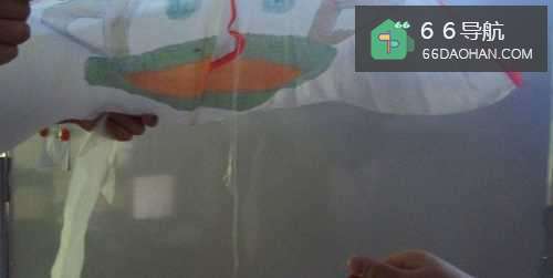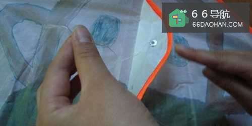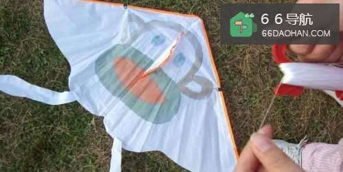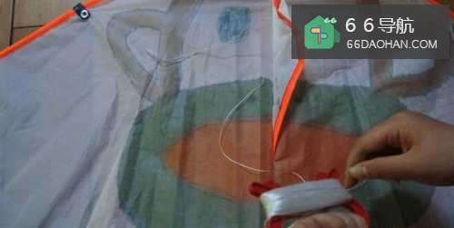 3 然后,要孩子把处册细线穿过风筝的固定点处,如下图所示。