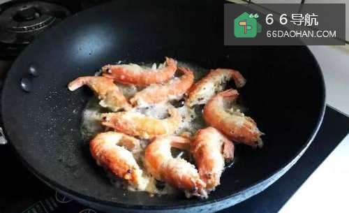 5爆香蒜末后加入酱汁、姜丝和辣香,煮滚后放虾,大火快炒虾子,直到酱汁收干