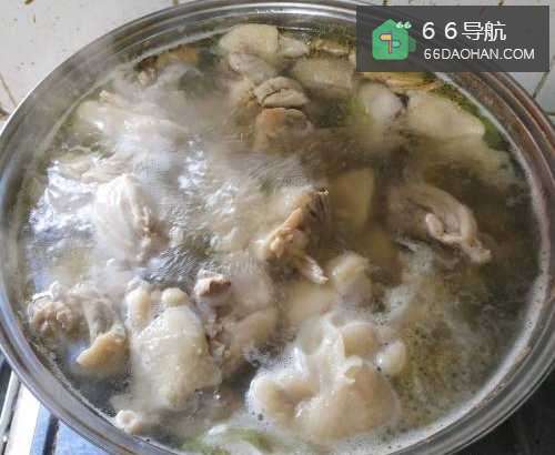 2水烧开后加入鸡块,煮沸至鸡块变色,没有血水。