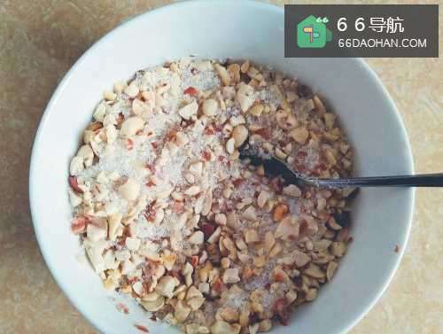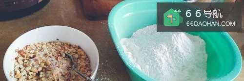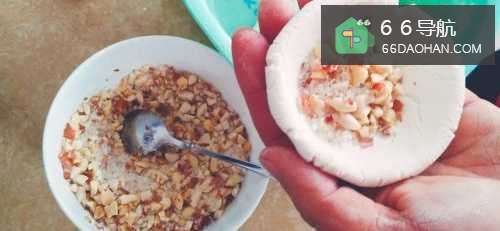 7切成一小团,一小团,捏成饺子皮形状,放入白糖花生馅;