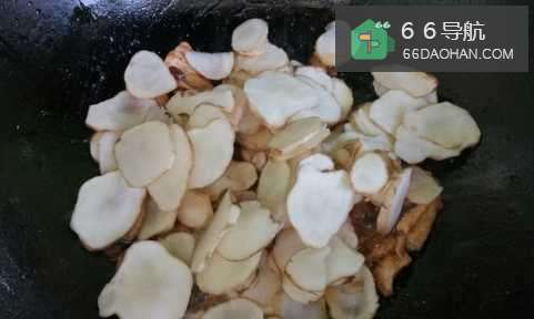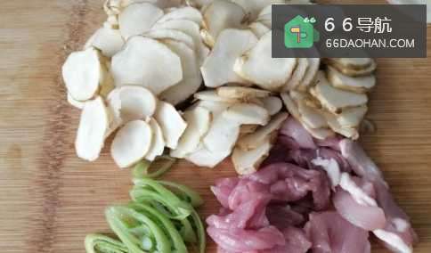2然后,用清水将洋姜洗干净切片,猪肉也切片;