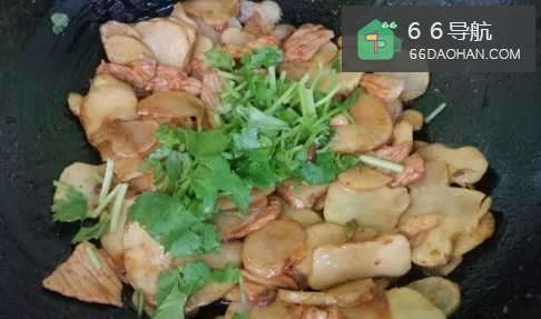 6最后,我们放入少量的香菜碎,小火炒匀就可以出锅了。