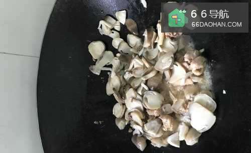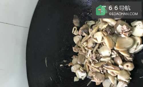 6等到焖煮的鸡肉煮熟了,倒入草菇翻炒。