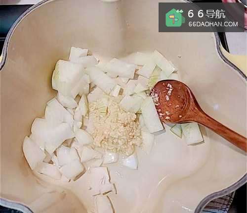 2下橄榄油先炒香蒜蓉和洋葱变软。
