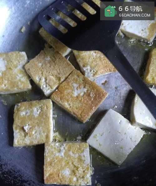 3锅中加入适量植物油,把切好的豆腐下锅煎,一面煎成金黄色后再翻另一面再煎。