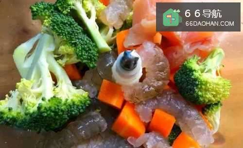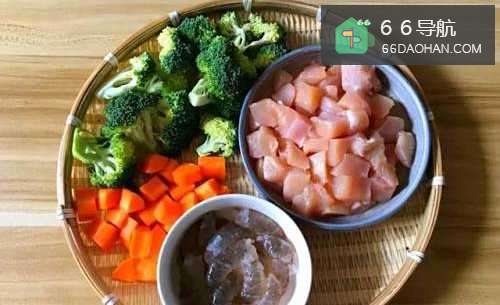 先把鸡胸肉洗净切成小块,虾仁去头去壳去虾线,然后再洗净,西兰花清洗干净,切成小朵,胡萝卜去皮切小块。