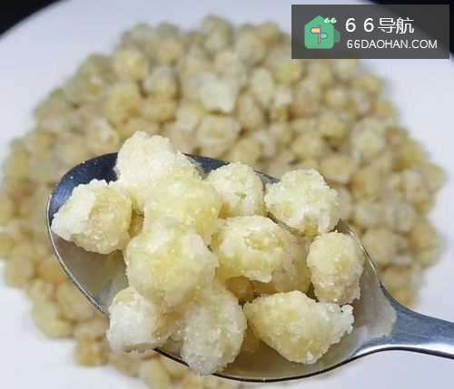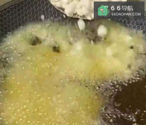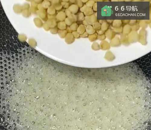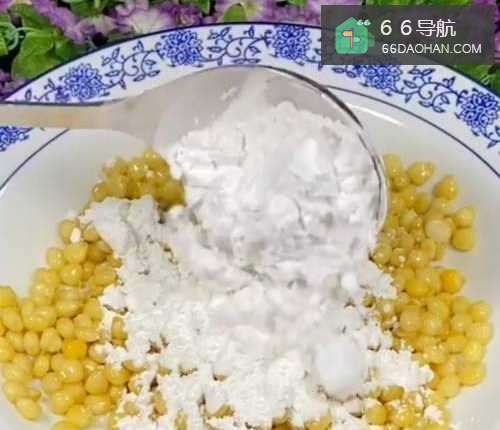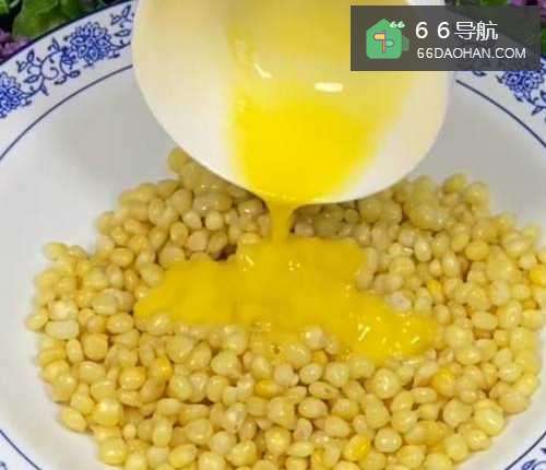 3锅里的油烧到6成热,然后把玉米粒分散倒入锅中,玉米进锅先不要急动它,以免淀粉脱落,10秒钟后再轻轻翻动,炸至微黄色捞上来控干油。