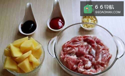 4土豆滚刀切备用,切好的肉放入玻璃器具中,加入蛋清。