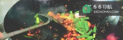 四.辣酱制好后倒入鸡丁和花生米翻炒。