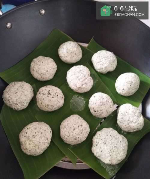 6第六步然后将做好的糯米糍放到香蕉叶子上面(也可以选用包子、馒头防粘的蒸布)这样可以避免粘锅。