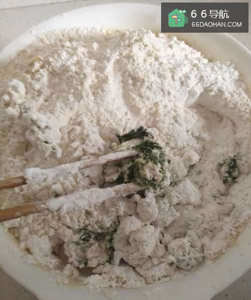 3第三步将切好的艾草倒入糯米粉里面搅拌均匀,并加入适量的艾草水将糯米粉和好,如下图所示。