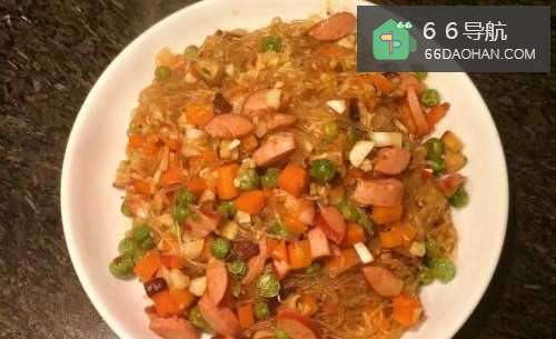 5倒入粉丝、酱油、糖,翻炒片刻即可。