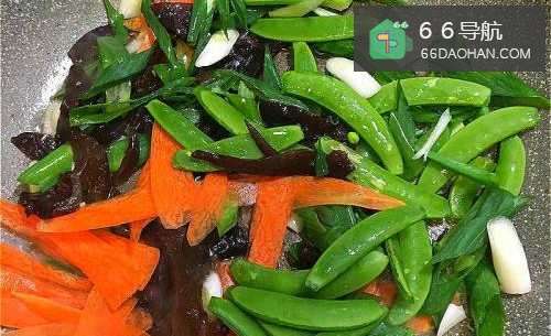 2油入锅加热,炒香蒜片,放入葱、红萝卜、木耳、甜豆翻炒均匀。