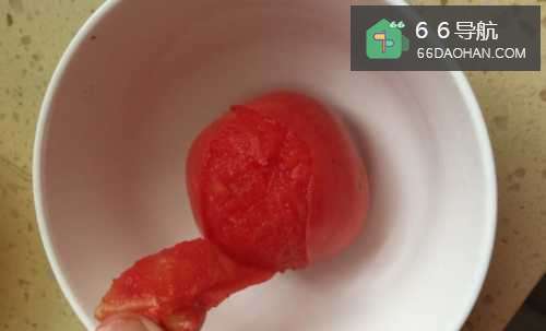 3将西红柿洗净放入碗中,向碗中倒入适量开水,待西红柿外皮裂开后剥去外皮。